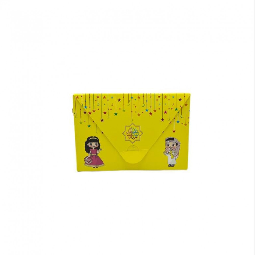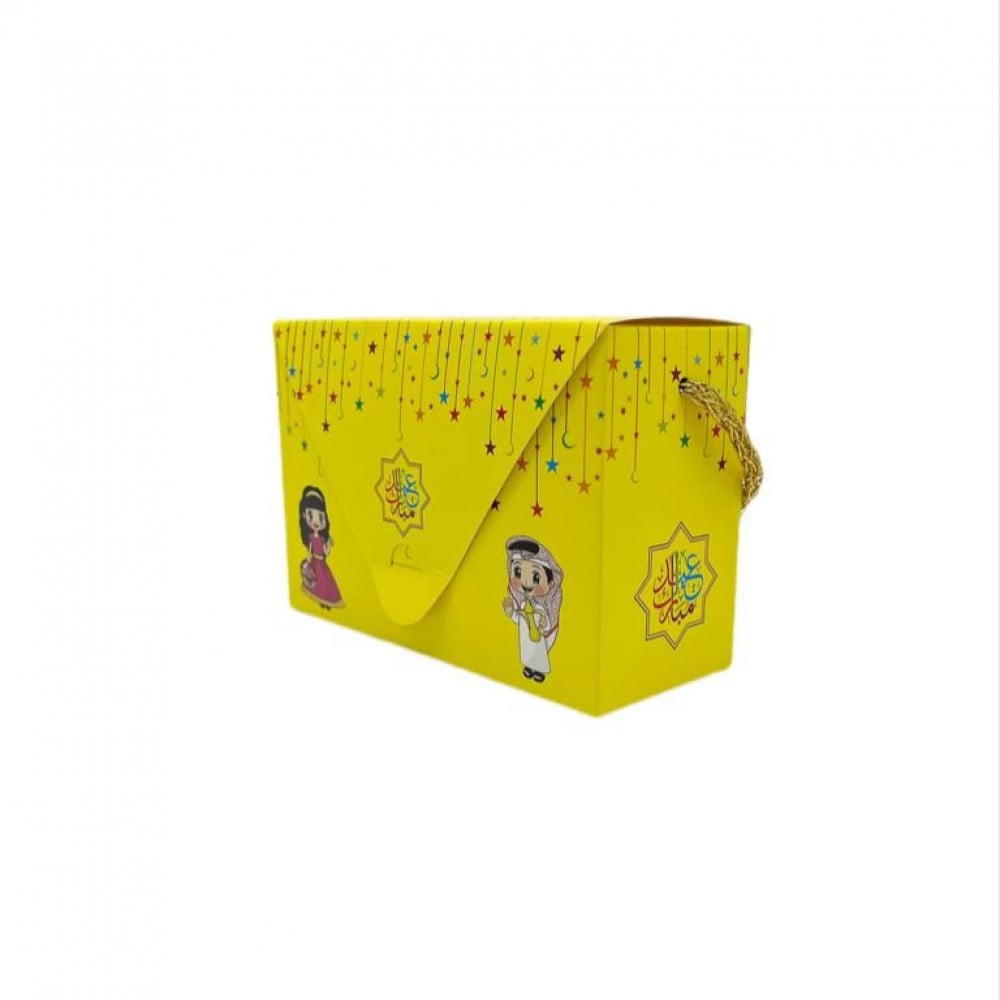 شارك بهجة العيد مع عائلتك وأحبابك بتقديم توزيعات حقائب ورقية بلون الاصفر ومختومة بعبارة "عيدكم مبارك" تحتوي على غطاء متصل للإغلاق